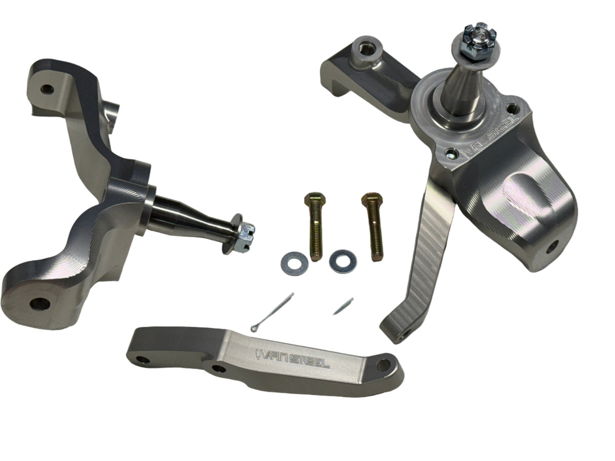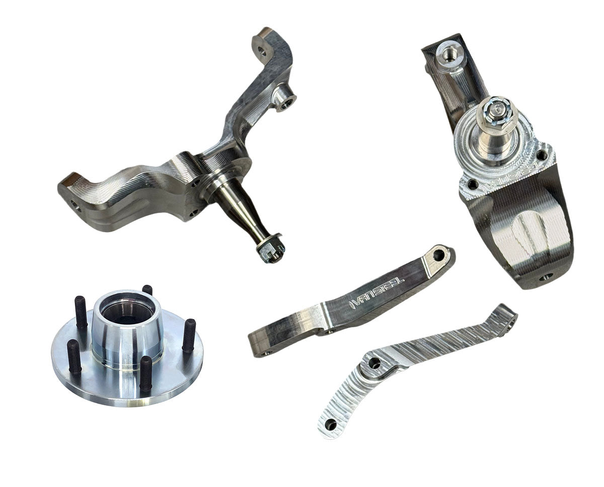 The spindles and steering arms reduce unsprung weight netting a 9 lbs. weight loss, 4.5 lbs. per side. Unsprung weight improves traction and stability by allowing the wheels to follow the contours of the road more closely, increasing tire contact and improving grip. With less mass moving up and down the wheels can change direction faster thus, making the car more responsive.