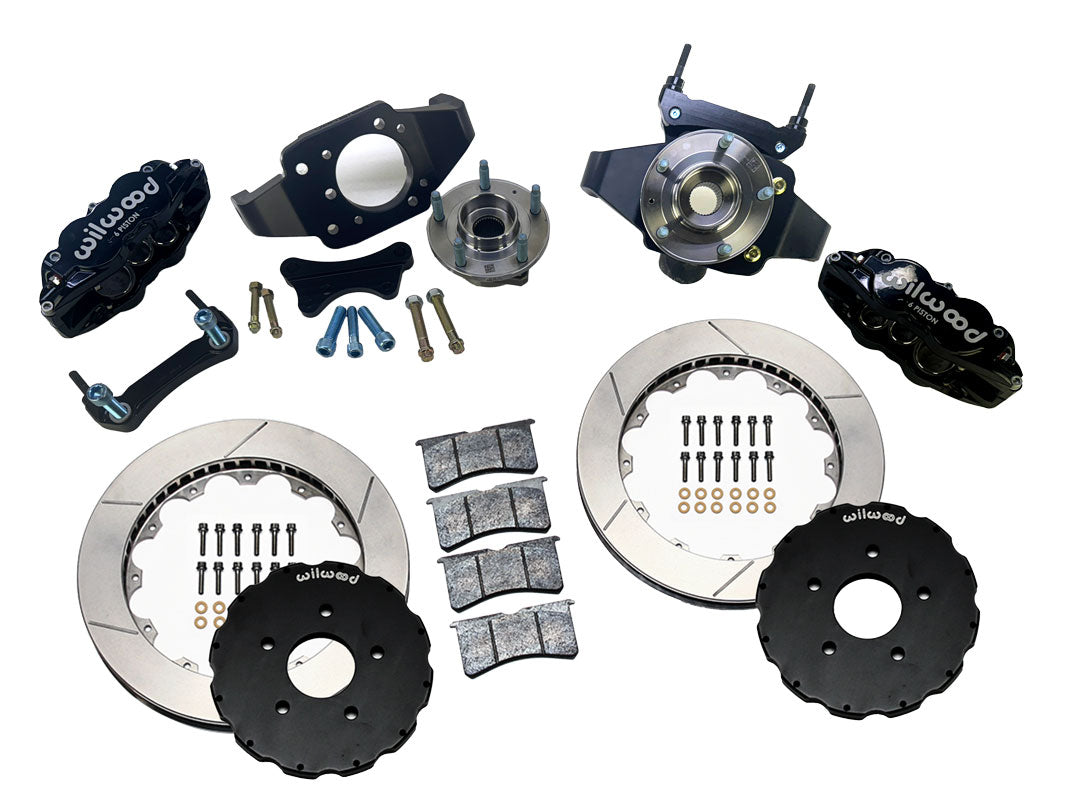 Spindles are designed around a C5/6 Wilwood front brake kit w/SL6 calipers. Factory C5/6 base rotors will also work.
