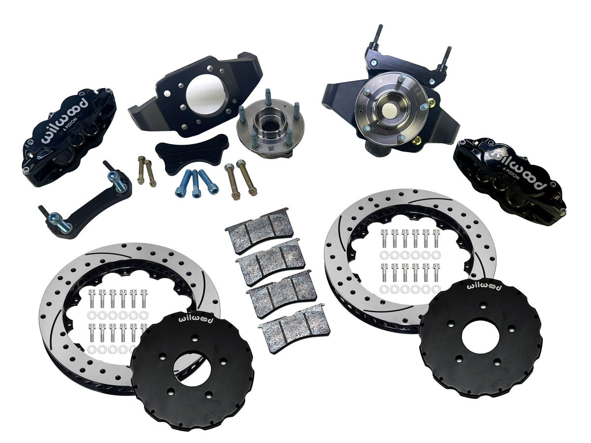 Spindles are designed around a C5/6 Wilwood front brake kit w/SL6 calipers. Factory C5/6 base rotors will also work.