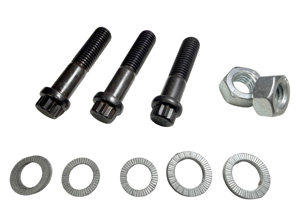 The 12 Point Flange Bolts replace the factory bolts that hold the bearing to knuckle. Twin-Locks are provided for all 3 bolts as well. The bottom bolt can be a bit cumbersome when trying to install the replacement lower ball joint nut and twin-lock. Lifting the knuckle and threading the nut works best.