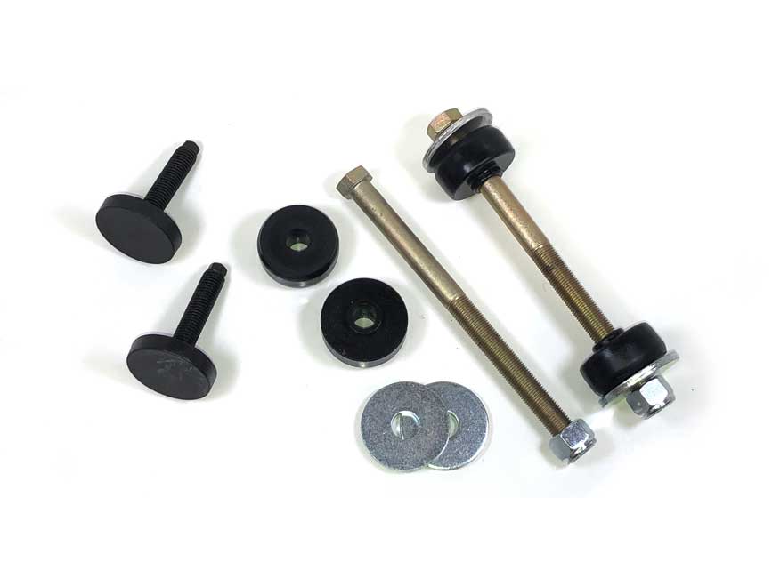 Front ride height adjusters thread into factory springs. These will NOT fit VBP front springs. It's best to smooth the mating surface on the LCA to increase the longevity of the poly pads. Our Grade 8, 8" spring bolt has 4" of thread so you can really dial in ride height.