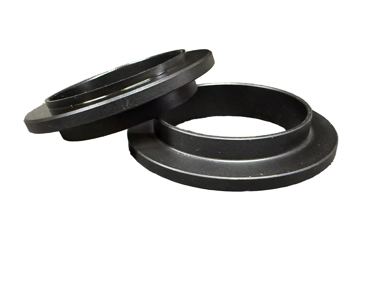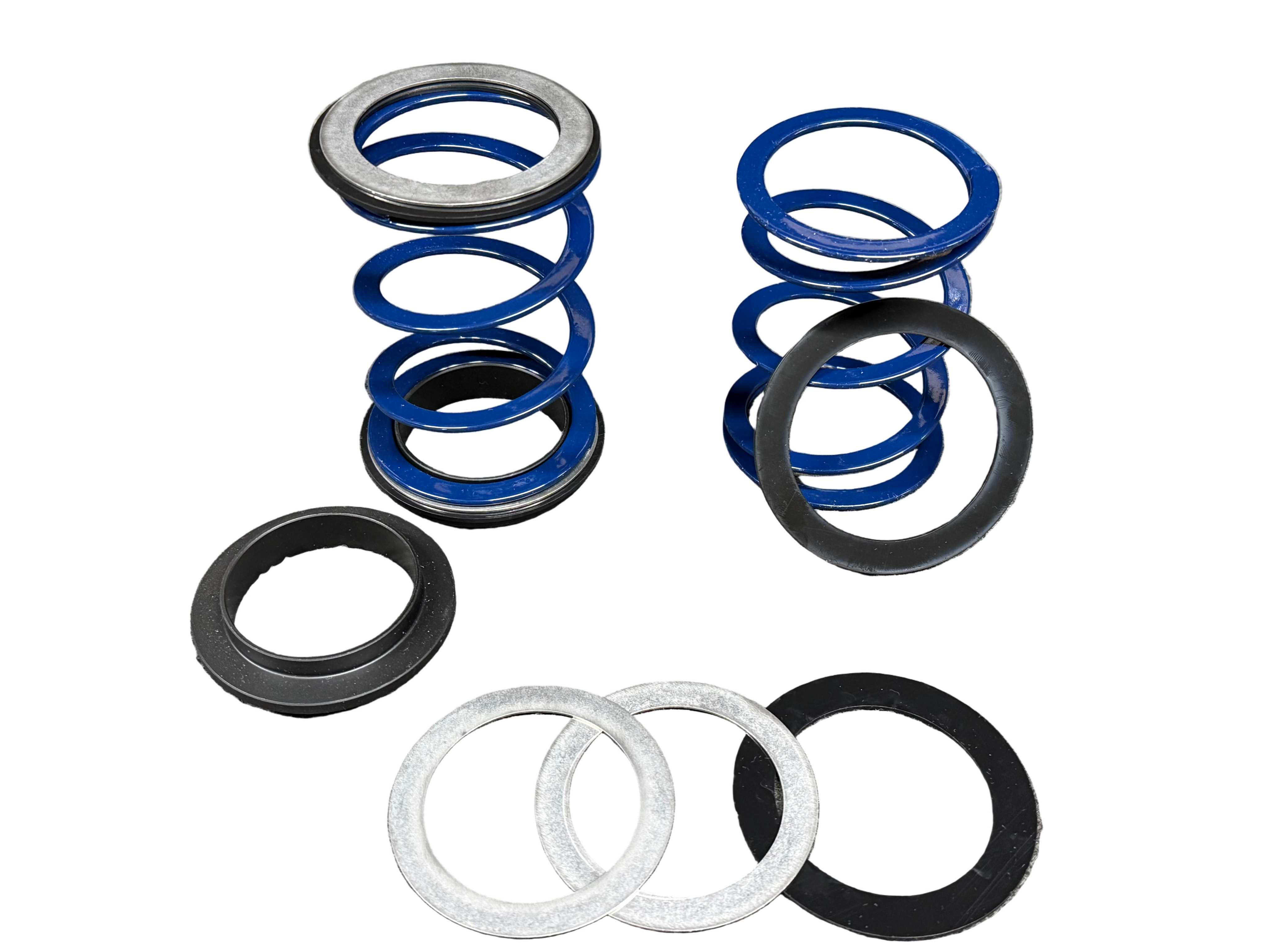 Helper springs are designed to constantly keep coilover spring collars engaged on the shocks eyelet, especially when lifting the car off the ground. The thin side of the coupler should be towards to collar and the thicker end into the spring. The Delrin thrust sheet needs to mate to the spring. Sold as a pair.