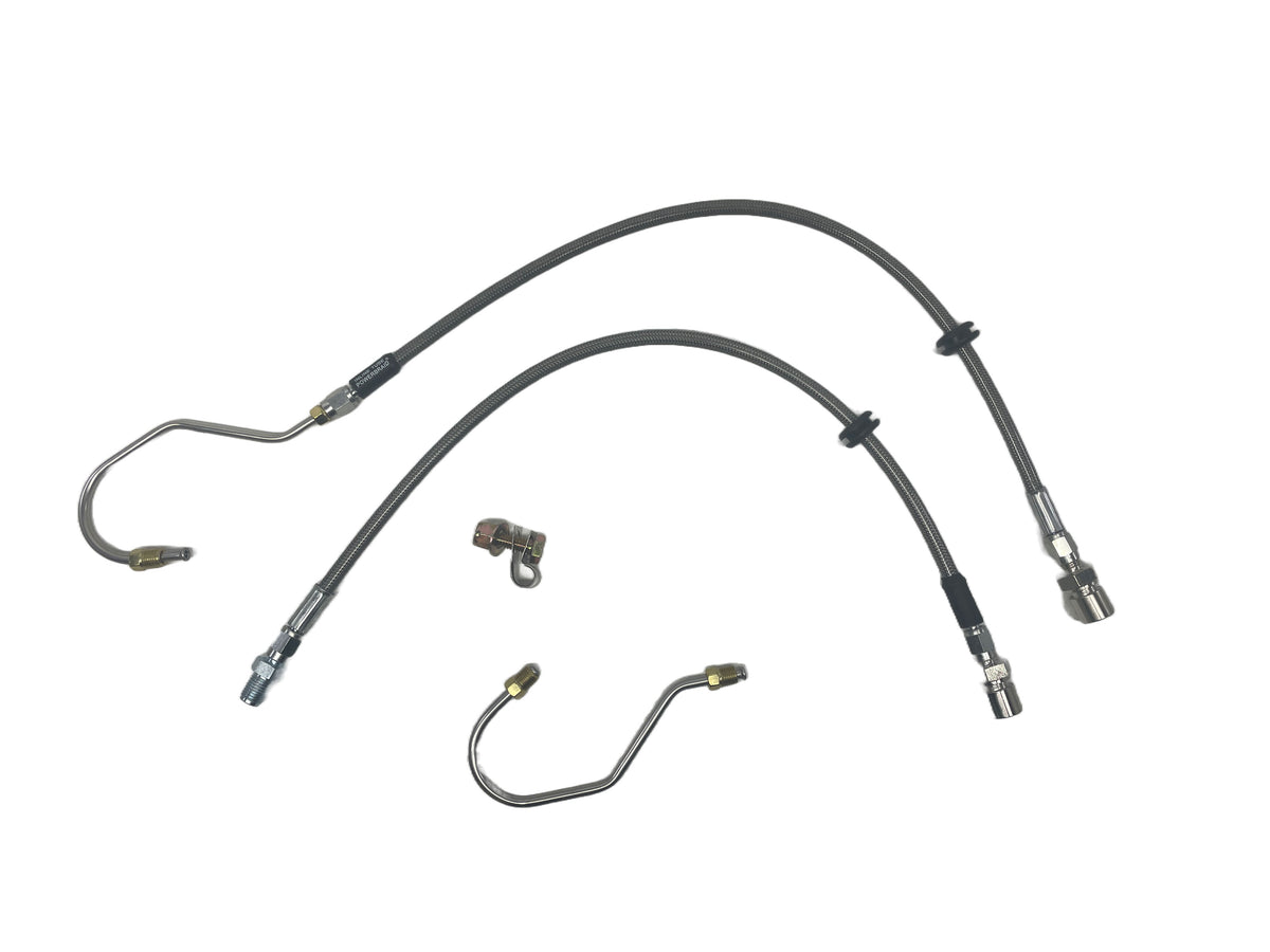 There are two main objectives for our longer rear line. One is to eliminate the drastic bend on the stock flex line, especially with offset t-arms. Second is ease of installation. Even with stock t-arms, getting new hard lines to mate up to the stock rubber lines can be a hassel.