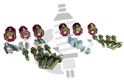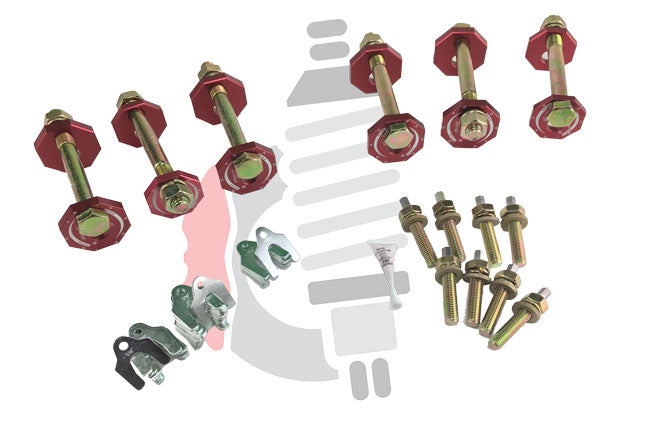 The kit includes shims for the Front and Rear Upper Control Arm mounting bolts for even more adjustability. Parts are made from 6061-T6 aluminum, anodized for corrosion resistance, and laser engraved with adjustment markings for ease of use.