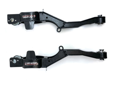 T-arms are offset 2 inches but it doesn't not move the bearing assembly. You retain your factory strut bars and half shafts. By running an offset trailing arm, it will allow you to run a wider tire on a stock rim or run a wider aftermarket rim with more backspacing (18" wheels are needed to clear the leaf spring). All arms are now cast and setup for a spherical bearing for reduced deflection and binding in the control arm pivot to increase handling and ride quality. You'll need to check for proper spring and sway bar clearance for wider than factory wheels. New to 2022 is our spherical bearing, cast trailing arm. The spherical bearing allows for increased handling and better ride quality. The bearing is teflon lined for long life, but is retained by a c-clip for ease of replacement if need be.