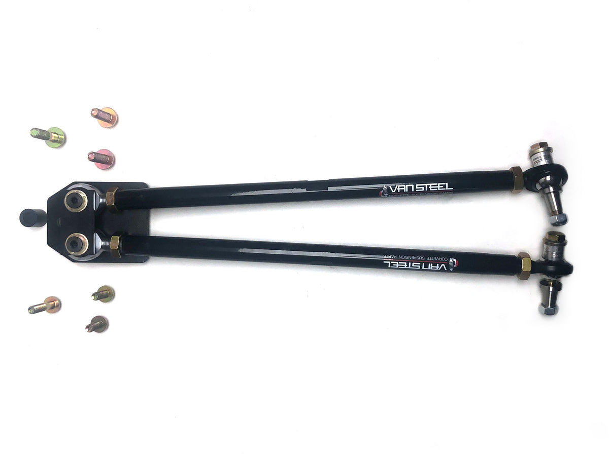 The factory toe rod assembly is inadequate for Corvettes used in serious autocross, track time or drag racing events. The stock toe rods deflect and allow untimely and unwanted toe changes. The result is the rear tires can cause wandering, increased E.T.’s and cause the lack of a positive sense of stability when drag racing. In autocross or track time driving, the toe change will upset the cars’ ability to corner and reduce the drivers’ confidence while cornering, resulting in slower lap times. The Center mount now has three adjustments to compensate for bump steer, ideal for lowered Corvettes or custom chassis setups.