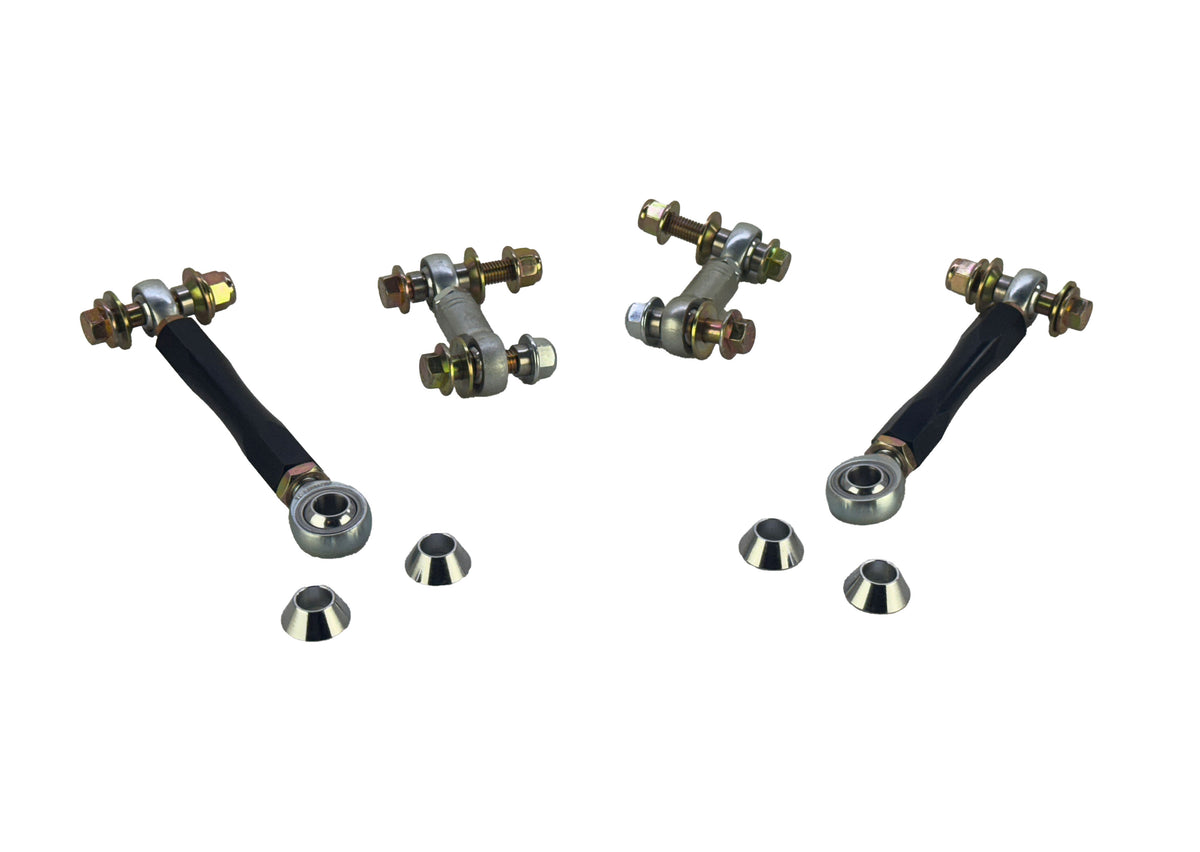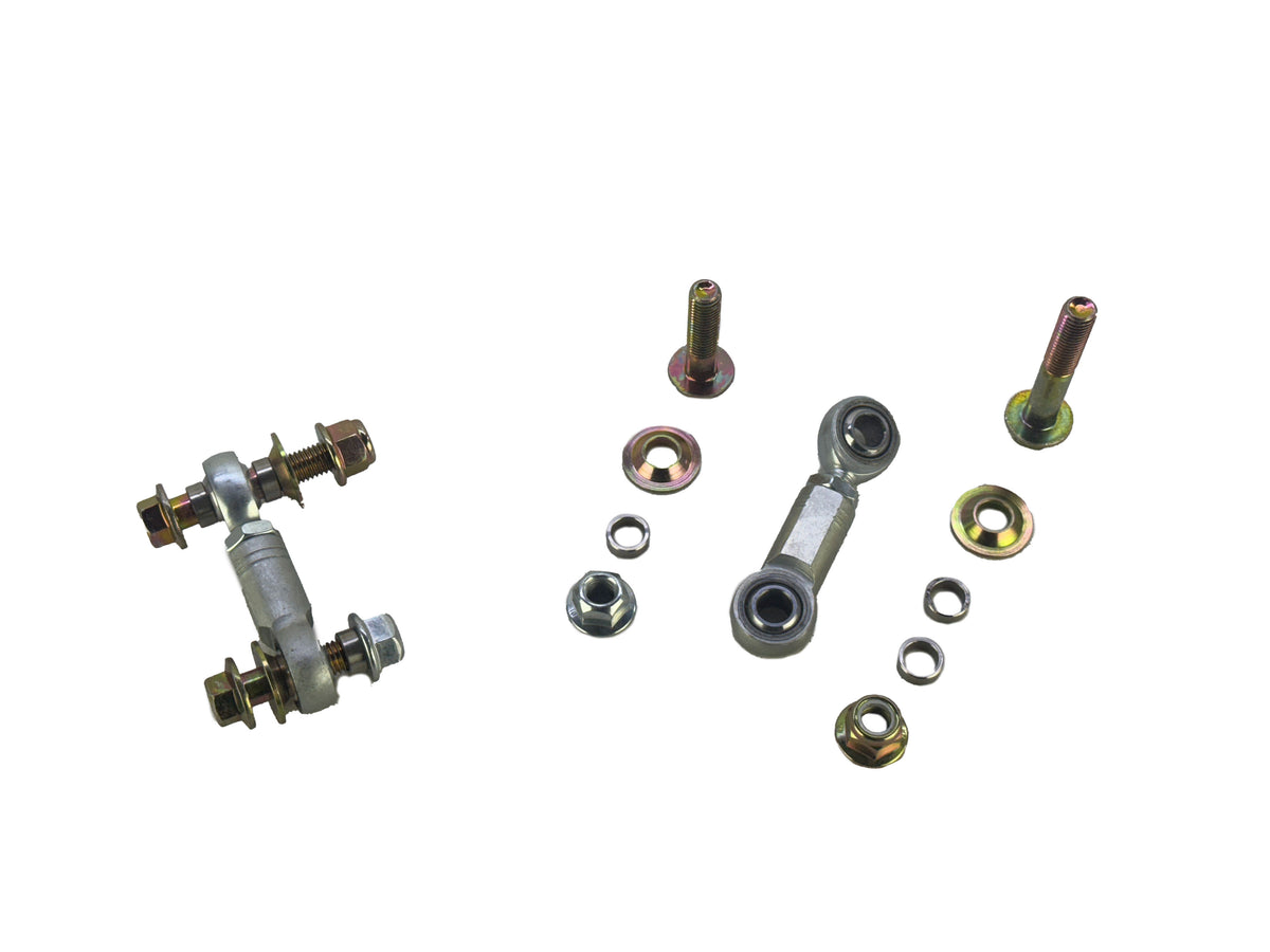 The advantage of using rod ends on end links is that they offer less compliance when loads are applied through the car's suspension. This offers more consistent alignment and more accurate and predictable handling. Premium FK Bearing rod ends are used and new hardware is provided to make it a bolt on kit.