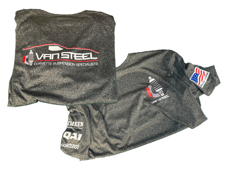 Van Steel crew shirts are what the team wears around the shop. Large Van Steel back graphic, small glyph front graphic, and sleeve graphics for our largest vendors. Made in USA or Van Steel over 40 years logo (will be 50 years in 2027).
